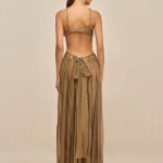 The Alexa Gown showcases Cult Gaia’s iconic cutout design, crafted from premium silk fabric elegantly bound with sophisticated gold-toned, brushed brass rings. Adjustable back straps with sliders and secure hook-and-eye closures ensure a perfect personalized fit. A graceful ribbon tie at the back waist offers additional customization. Expertly folded and bound silk ribbons along the waistline create the flowing long skirt, while wider bands at the waist provide elegant coverage. Dramatic high slits deliver effortless movement and captivating allure throughout this stunning dress.