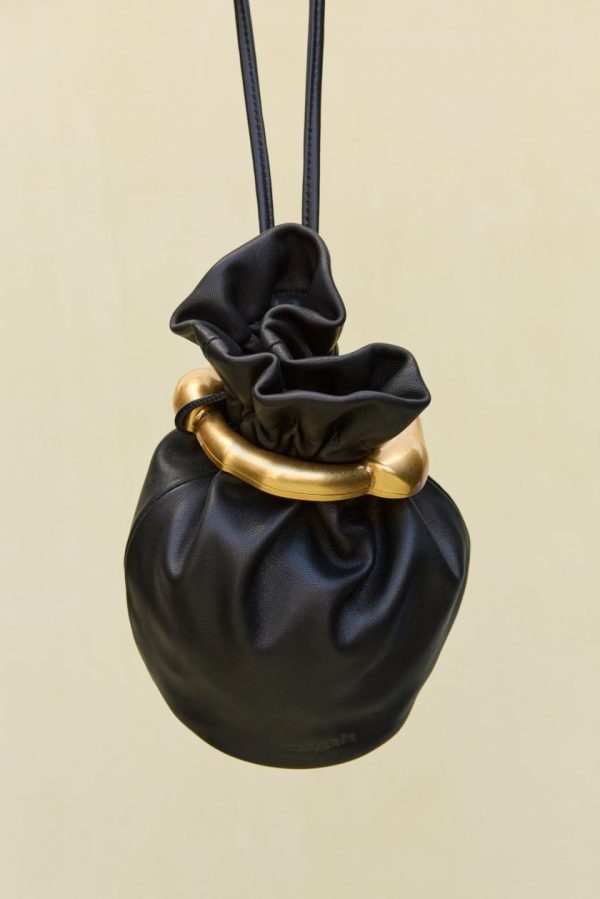 An exquisitely crafted wristlet bag designed in premium leather featuring our signature abstract brass buckle as sophisticated closure hardware.