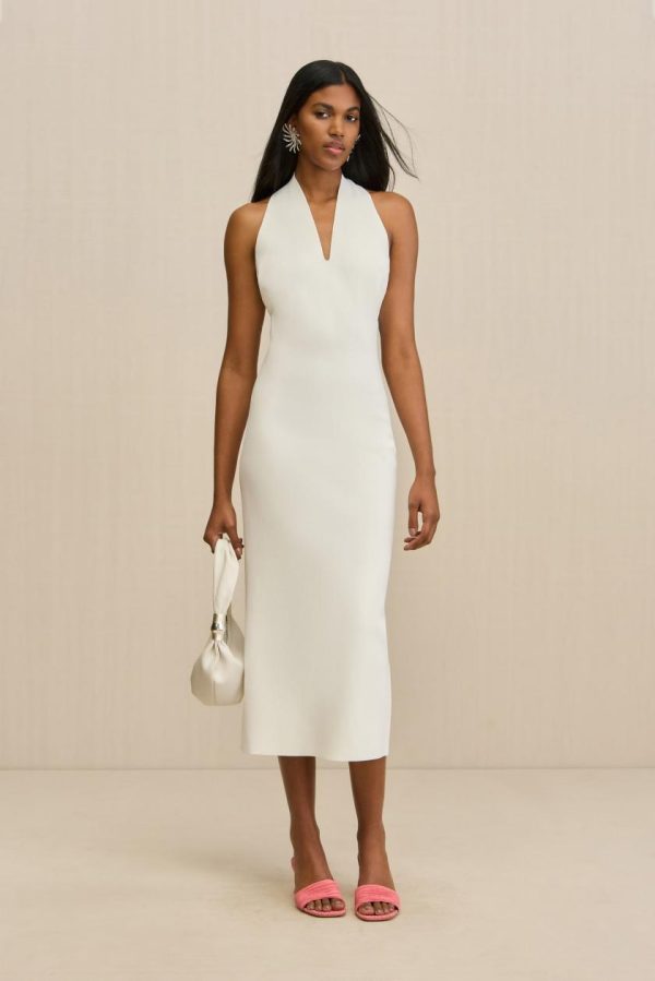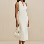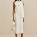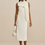 Experience timeless elegance with this sophisticated wool cashmere blend midi dress featuring a flattering low back design and versatile removable scarf.