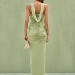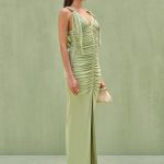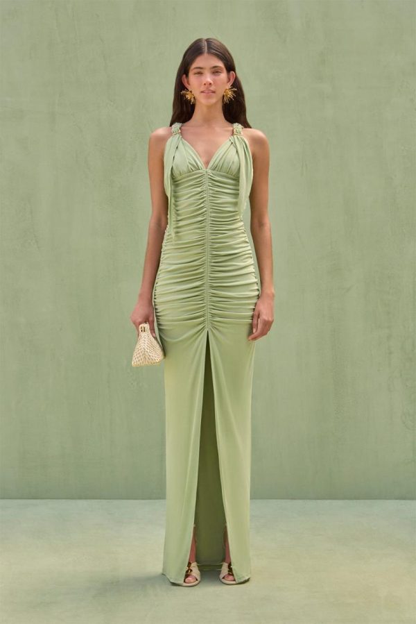 Experience effortless sophistication with this sleek viscose maxi dress featuring elegant ruching and distinctive shoulder buckle accents with Cult Gaia’s signature brass hardware.