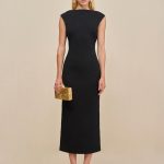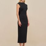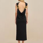 Discover sophisticated elegance with this beautifully crafted knit midi dress, featuring a stunning dramatic cowl back accented with two pleated golden embellishments.