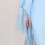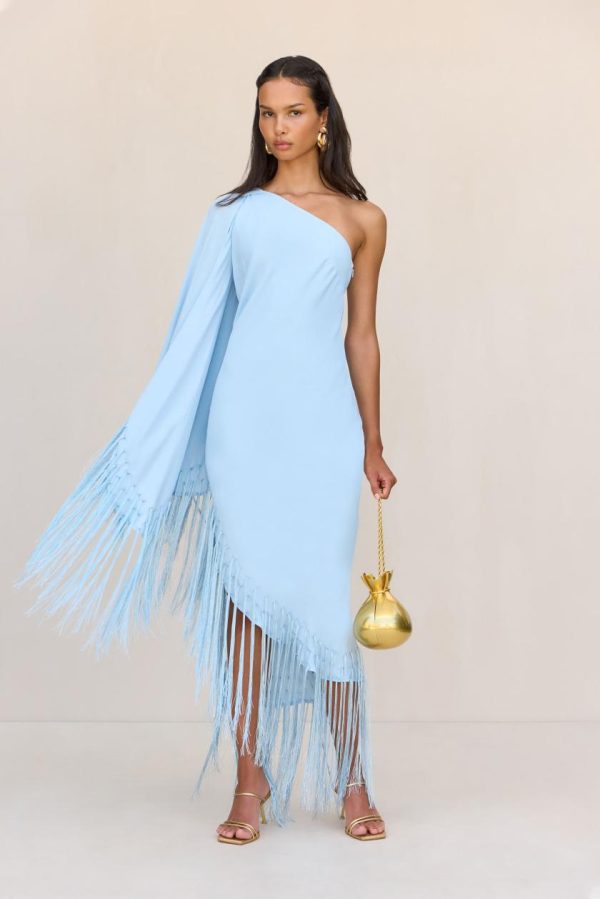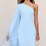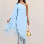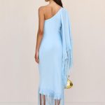An exquisite occasion dress that commands attention with its striking asymmetric neckline and elegant fringe detailing that gracefully adorns both the hem and sleeve.