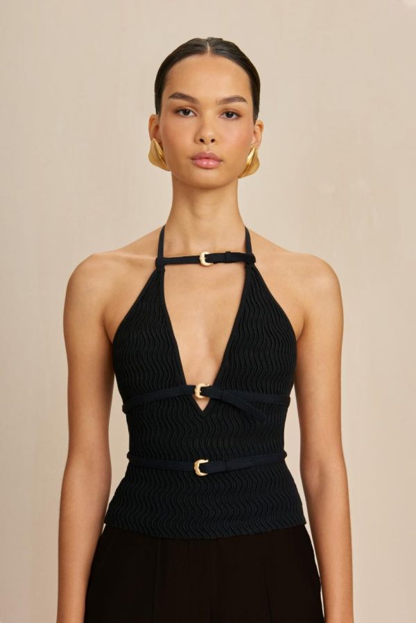 Experience sophisticated style with this plunging V-neck top featuring an elegant wavy knit pattern and three luxurious gold-toned adjustable buckles and straps.– Textured, brushed-brass buckles– Adjustable straps– Stretch fit– Wavy pattern knit
