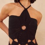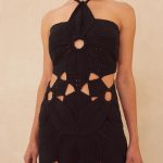 Discover the stunning Floreana Knit Dress in sophisticated Black. The exquisite floral patterns create an elegant halter neckline with customizable ties at the back for your perfect fit. Signature Cult Gaia cutouts at the center bust and along the waistband beautifully complement the open knit design. Two strategically placed straps cross the mid and low back for exceptional support and silhouette definition. A delicate scalloped hemline adds a touch of allure to this artisanal masterpiece.