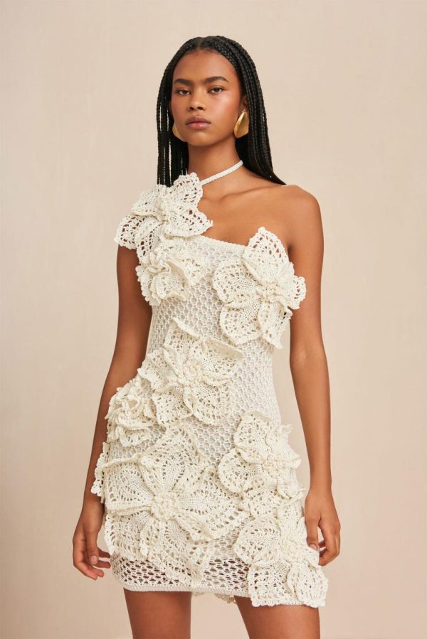 An exquisitely hand-crafted mini dress featuring stunning three-dimensional floral knit details that create a show-stopping silhouette.– Adjustable ties behind the neck for customizable fit– Fully lined for comfort and coverage– Fashionably open knit construction– Sophisticated one-shoulder design