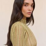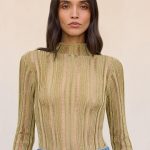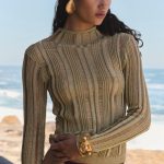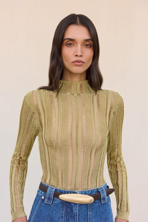 Elevate your wardrobe with this exquisite semi-sheer long sleeve top featuring a luxurious metallic gold knit fabric that catches the light beautifully.
