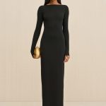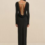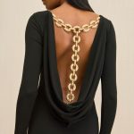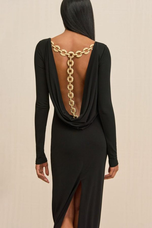 An impeccably sleek matte jersey gown featuring a sophisticated high neckline, dramatic cowl back design with striking chain detailing for elevated elegance.