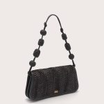 Elevate your style with this sophisticated black raffia shoulder bag featuring a secure flap closure and exquisite appliqué detailing along the strap.