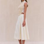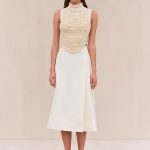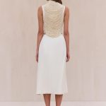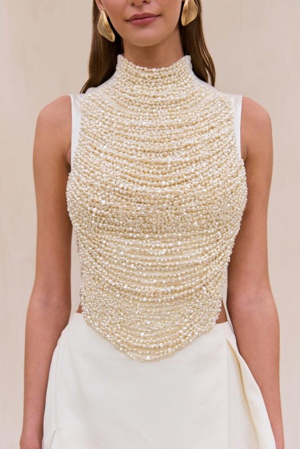 An exquisite artisanal top featuring hand-beaded faux pearl arcs gracefully layered over a delicate mesh underlayer for a sophisticated statement piece.