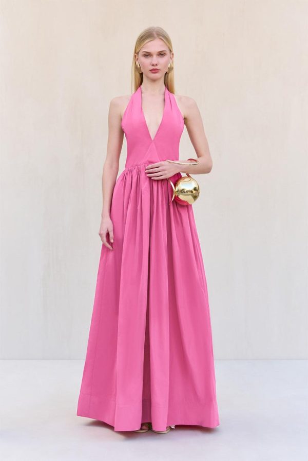 An effortlessly flirty faille taffeta maxi dress featuring a dramatic plunge neckline with an integrated inner bodysuit for secure, comfortable wear all night long.