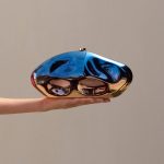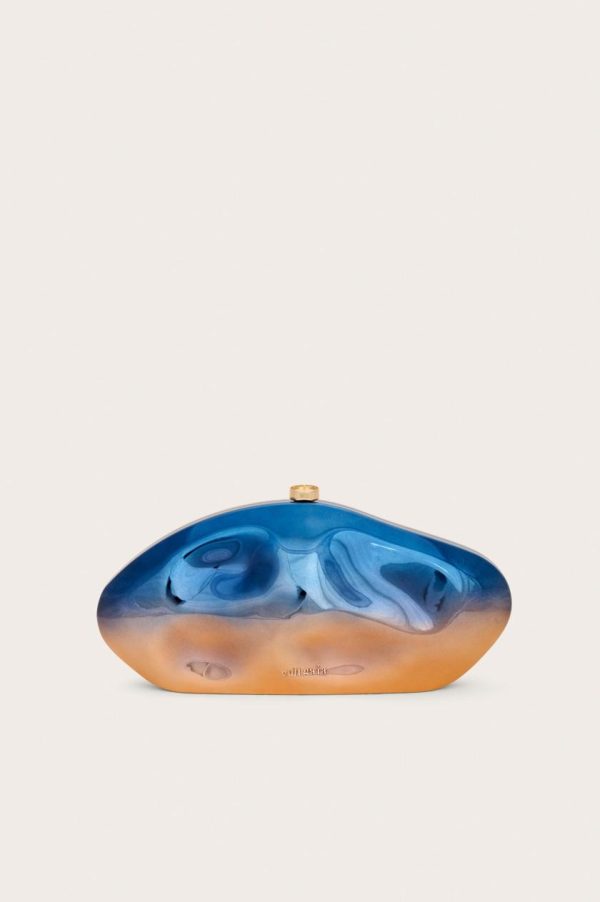 The Caldera Clutch makes a stunning sculptural statement with its ultra-shiny ombre finish that catches the light beautifully. The textured surface creates captivating reflections, while the secure gold-toned clasp keeps your essentials protected. Designed with a stable flat base, this piece stands elegantly as a true work of art.