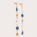 Make a sophisticated statement with these elegant drop earrings featuring faux pearls, captivating blue-hued stones, and gleaming gold beads.