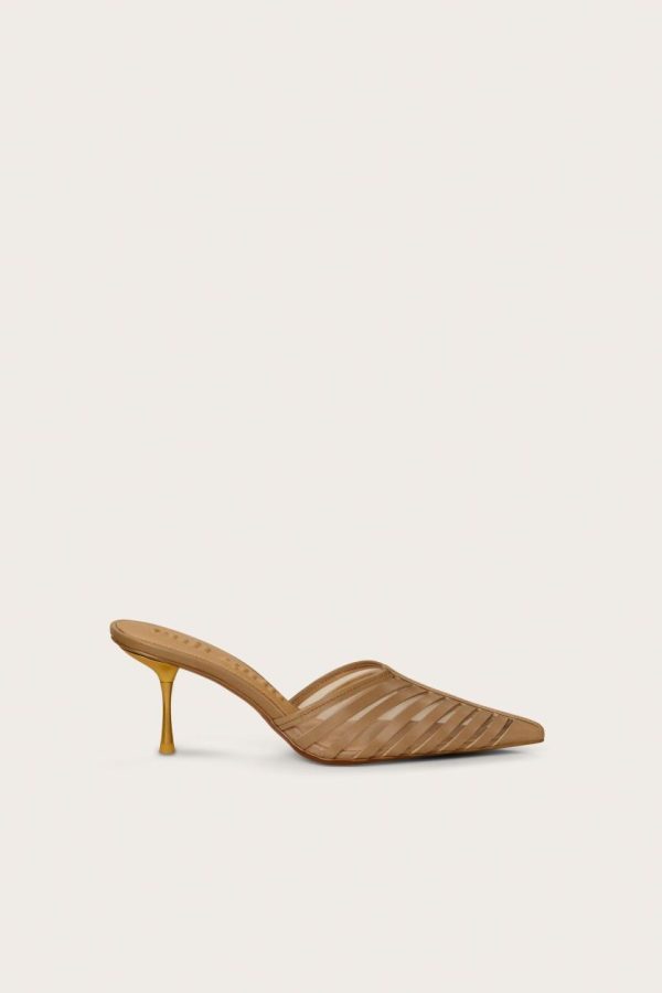 Elevate your evening ensemble with these exquisitely crafted pointed toe mules, expertly fashioned from alternating mesh and leather strips for a sophisticated look.