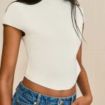 Elevate your wardrobe with this beautifully cropped short sleeve knit top, featuring a sophisticated mock neckline and gracefully curved hem for a modern silhouette.