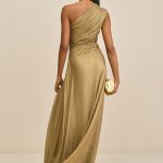 Make a stunning entrance in this exquisite draped one-shoulder silk gown featuring a sophisticated front leg slit and elegant gold-toned hardware accent at the waist.