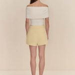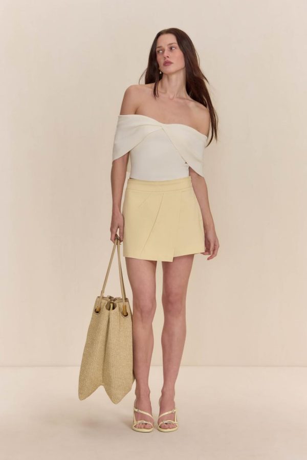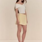 A mini skort with faux wrap detailing in the front and exposed shorts in the back.