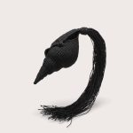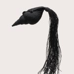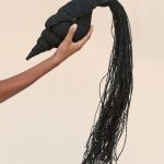 A shell-shaped clutch with a lined drawstring interior and a black rattan exterior.