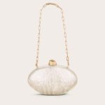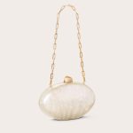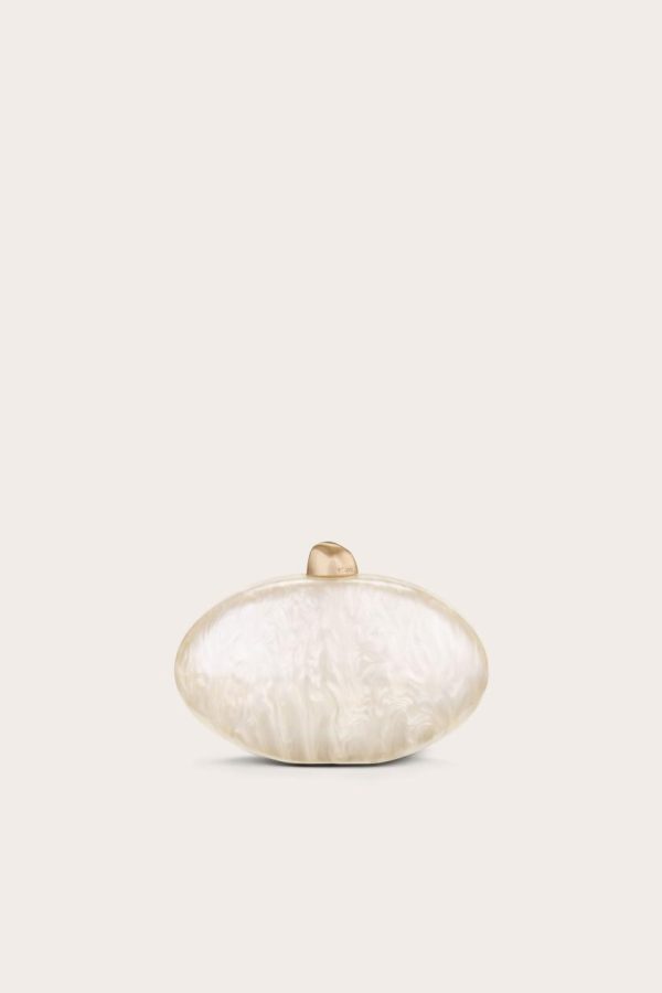 A pearlized acrylic oval shaped clutch with an abstract gold top closure and removable chain strap.