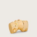 A molded scrunch shape forms the shiny gold metallic shell of this handheld clutch.