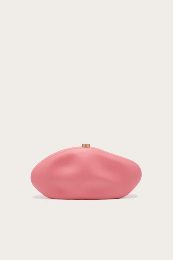A sculptural clutch wrapped in leather with a flat bottom and gold clasp at the top.
