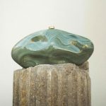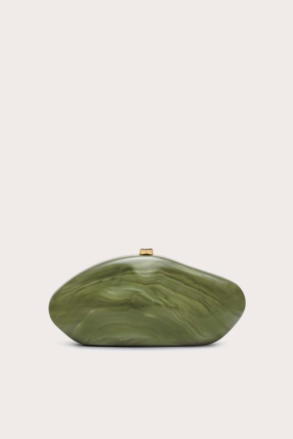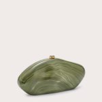 A sculptural clutch made of marbled green acrylic with a flat bottom and gold clasp at the top.