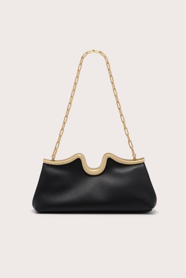 A sculptural leather clutch featuring wavy brass trim and a removable chain strap.