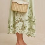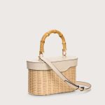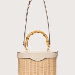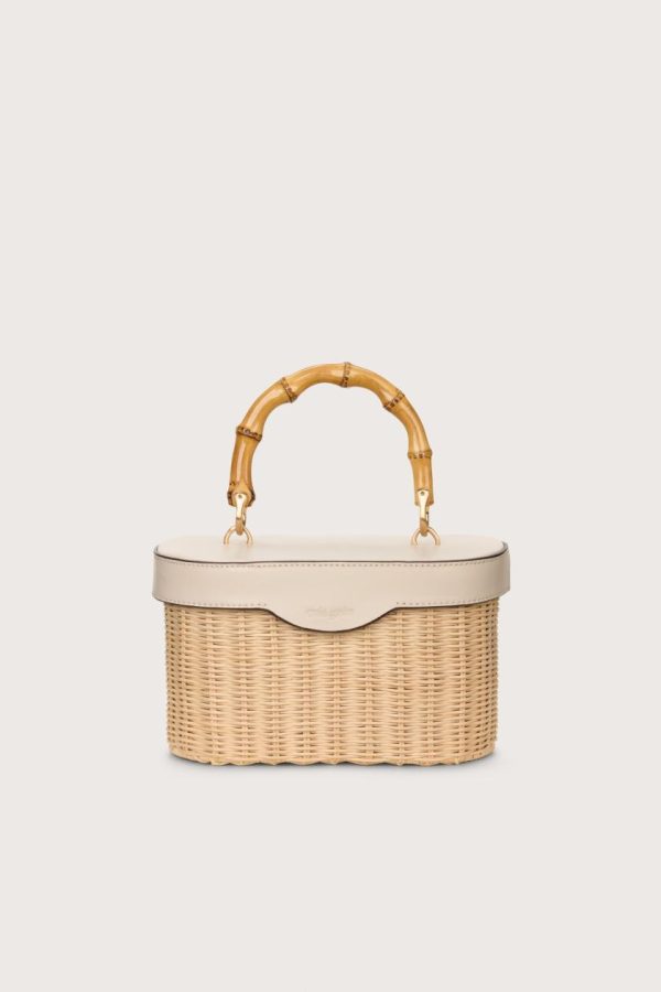 A bamboo top handle lunch box-shaped silhouette designed in a natural rattan and creamy leather.