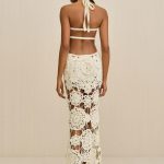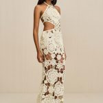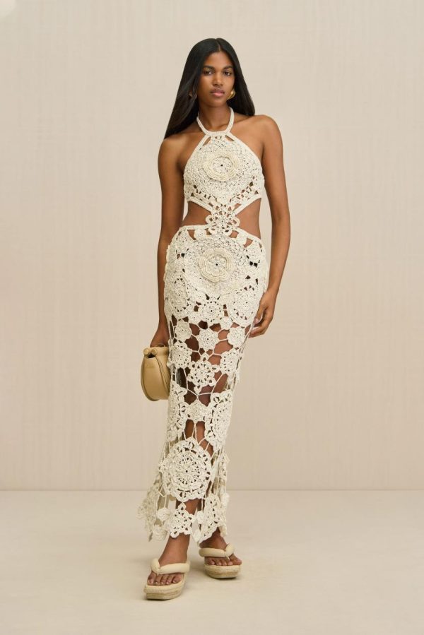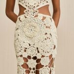 An ankle-length artistic gown made from hand-crocheted geometric and floral patterns.
