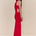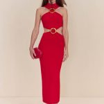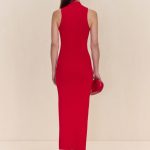 A fitted midi-length knit dress with gold-toned hardware, a high neck design, and side cutouts.