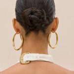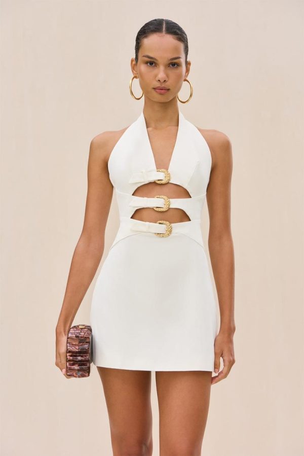 A halter mini-dress with adjustable, textured shiny brass buckles.