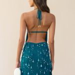 An adorned mini dress with droplet shaped beads, a high neck and an open upper back.