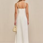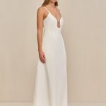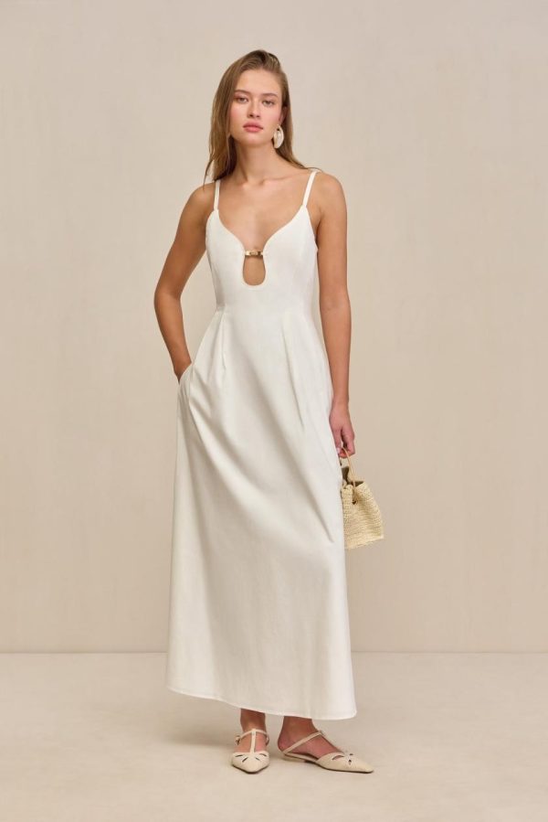 A cotton poplin plunge maxi dress with a fitted bodice and adjustable shoulder straps.