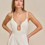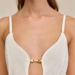 — Plunge neckline with gold tone hardware
