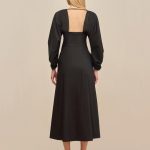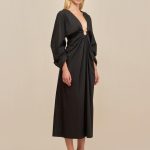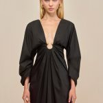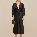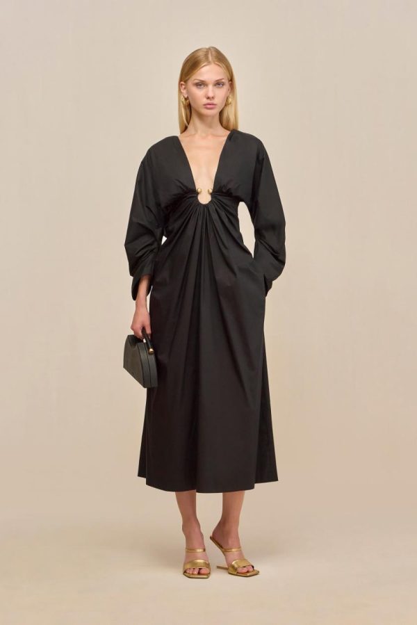 An effortless poplin midi dress with a plunging neckline and golden hardware at the bust.