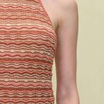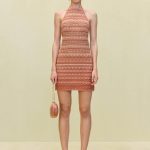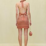 A knit halter dress with tonal stripes and large bow ties at the low back and high neck.