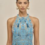 An ornate beaded mini dress crafted in a tonal mosaic pattern with a nude mesh underlayer.