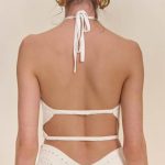 The Floreana Knit Dress in Off White stuns. The floral designs create a halter neckline with adjustable ties behind the neck. Signature Cult Gaia cutouts are seen at the center bust and along the waistband, which compliment the open knit style. Two straps cross the mid and low back for excellent fit. A scalloped hemline offers a touch of seduction to this artisanal outfit.
