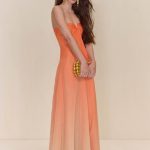 An ultra-flowy gown featuring a fitted bodice with a sharp, triangular cutout at the central bust that compliments the spread of the ankle-length hem.
