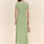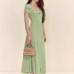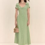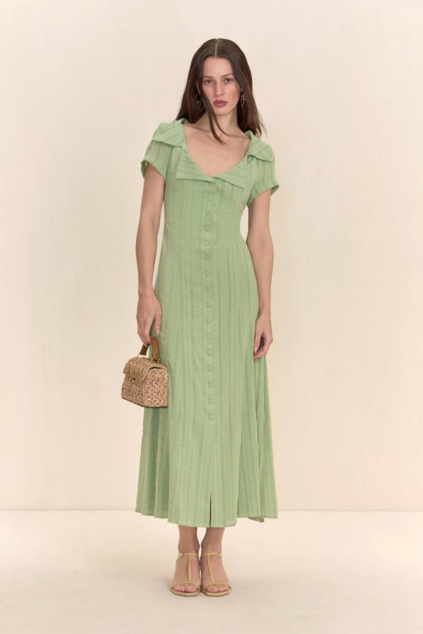 A midi length peasant dress made from textured voile with lapels and a functional button down front.