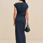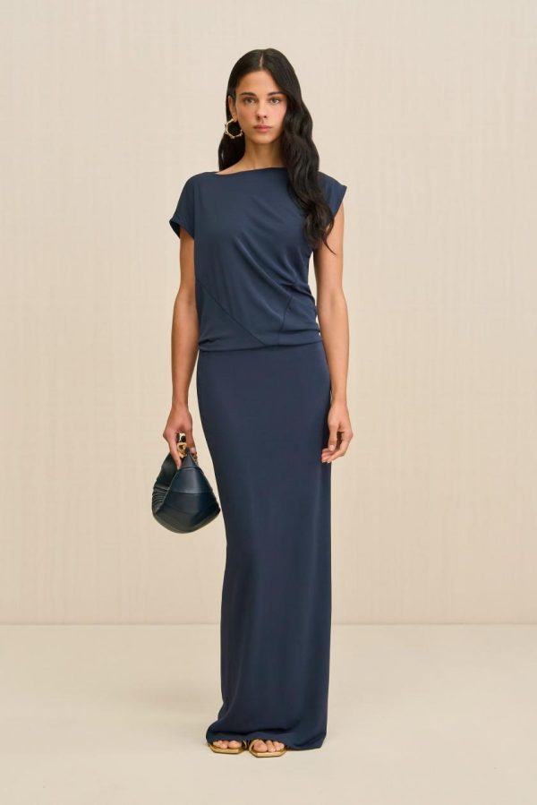 A slinky maxi dress featuring cap sleeves and elegant draping throughout.