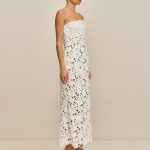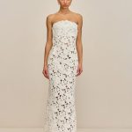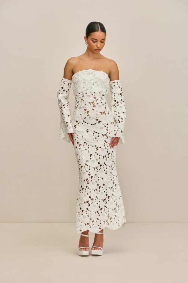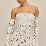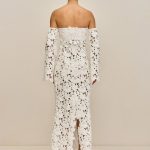 A breathtaking semi-sheer gown fashioned out of floral lace with matching removable sleeves.
