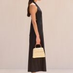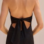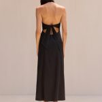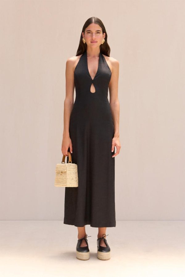 A plunge halter linen midi dress with a keyhole bust detail and adjustable self tie back.