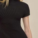 A mini knit dress with radial stitch detailing that features an asymmetrical mock neck and short sleeves.