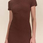 A mini knit dress with radial stitch detailing that features an asymmetrical mock neck and short sleeves.