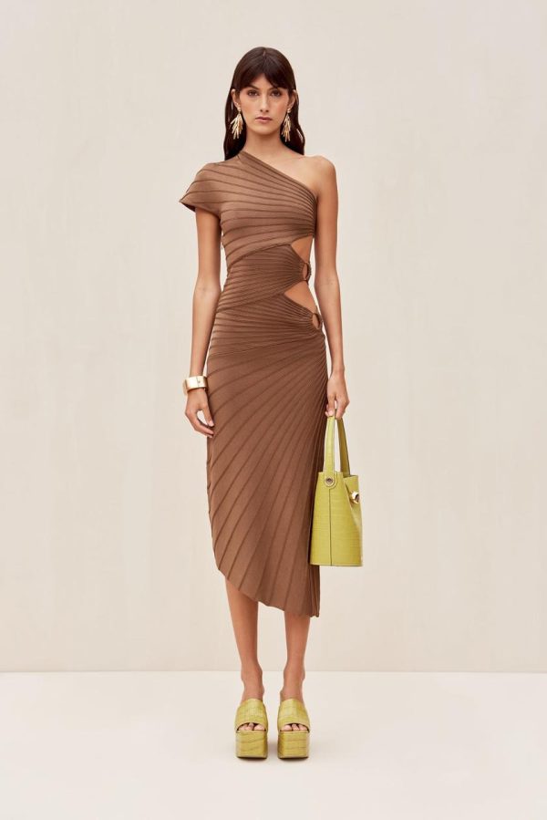 The Lurenz is an asymmetrical knit masterpiece. This dress has ribbed sunburst panels with signature Cult Gaia cutouts held together by gold-toned, brushed brass oblong rings at the left side. The right covered sleeve balances the exposed left shoulder, while an irregular hem enhances the sunburst effect.