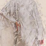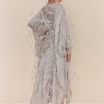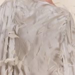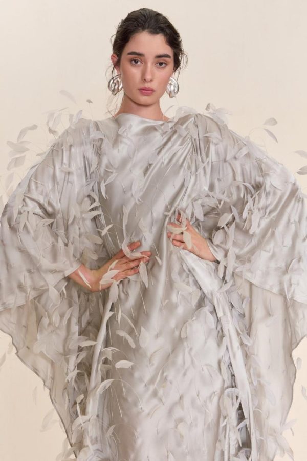 A long sleeve silk gown featuring hand-embroidered tonal feathers.