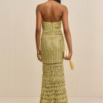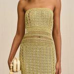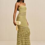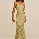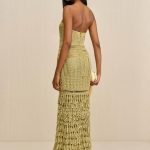 A breathtaking floor length gown designed with a fitted bodice and intricate hand crochet detailing throughout.