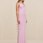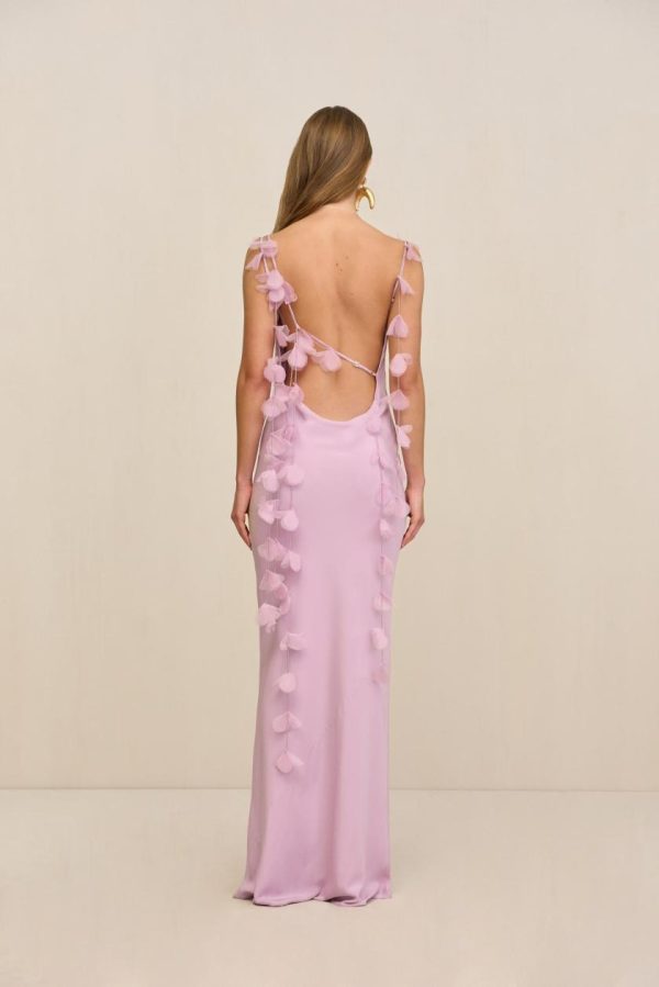 A true work of art— this gown is crafted from matte air satin silk and features a waterfall of silk organza flower petals that drapes across the back shoulders.