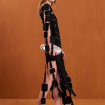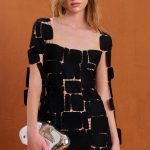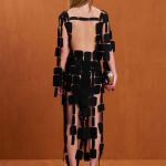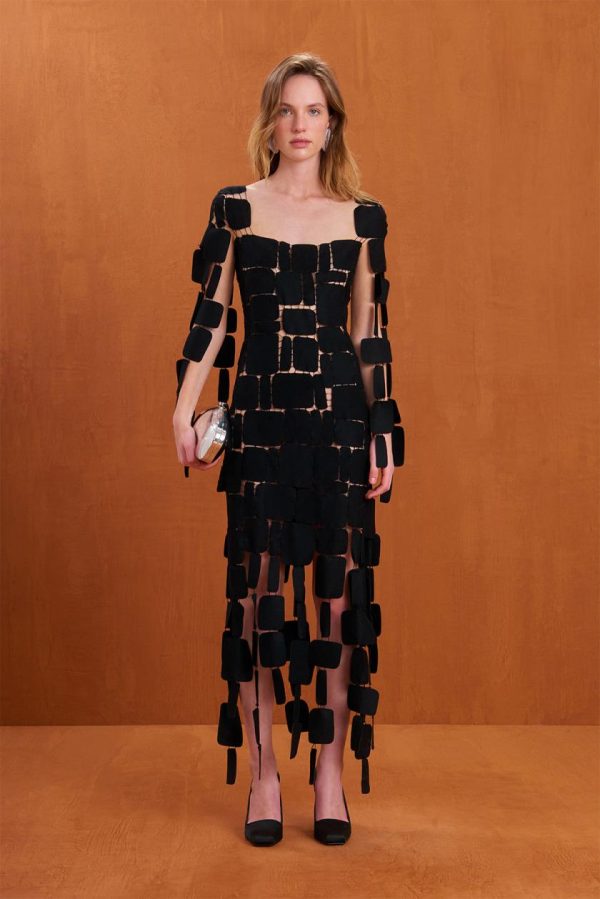 A woven midi dress made from abstract discs sewn together that allows for movement at the sleeves and bottom hem.
