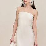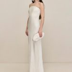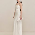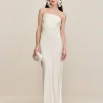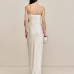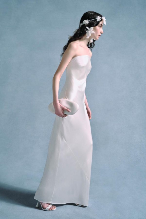 An air satin strapless floor-length gown with slightly tapered sides for a flattering fit.